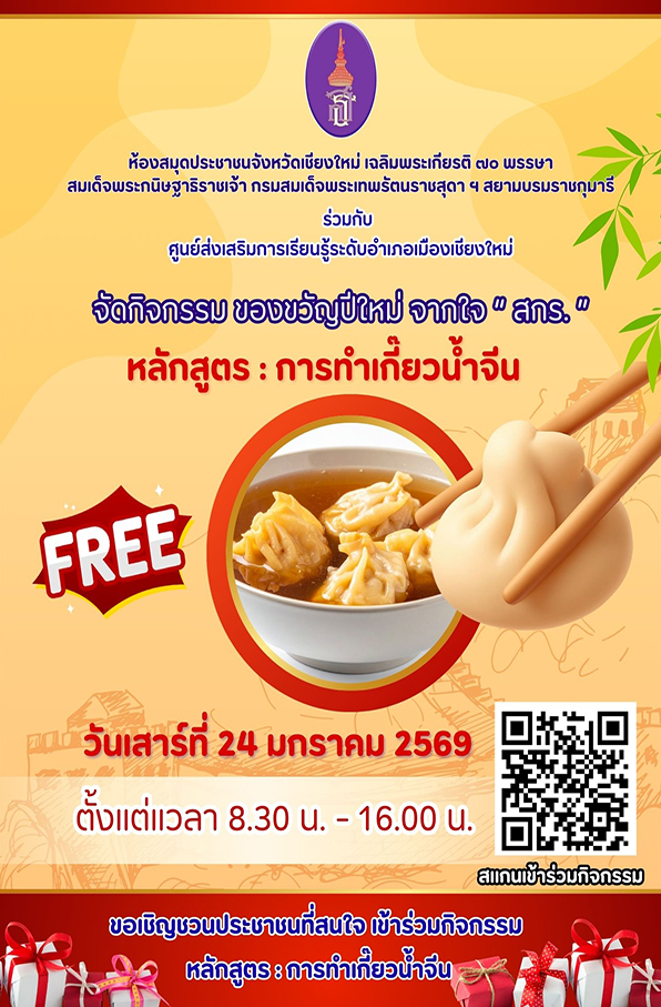 กรมส่งเสริมการเรียนรู้ จัดกิจกรรม ของขวัญปีใหม่ จากใจ สกร. โดย ศูนย์ส่งเสริมการเรียนรู้ระดับอำเภอเมืองเชียงใหม่ สอนการทำเกี๊ยวน้ำจีน โดยเปิดรับสมัครประชาชนผู้สนใจ