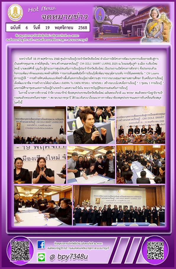 ระหว่างวันที่ 18-19 พฤศจิกายน 2568 ศูนย์การเรียนรู้ประจำจังหวัดเชียงใหม่ ดำเนินการจัดโครงการพัฒนาบุคลากรเพื่อยกระดับสู่การเป็นองค์กรคุณภาพ ภาพใต้จุดเน้น “สกร.สร้างคนฉลาดเรียนรู้” CMI DOLE SMART LEARNS 2025 ณ โรงแรมคุ้มภูคำ อ.เมือง จ.เชียงใหม่โดยมี นายพงษ์ศักดิ์ บุญเป็ง ผู้อำนวยการศูนย์ส่งเสริมการเรียนรู้ประจำจังหวัดเชียงใหม่ เป็นประธานเปิดโครงการดังกล่าว ซึ่งประกอบด้วยกิจกรรมพัฒนาทักษะแห่งอนาคตด้านดิจิทัล การยกระดับผลสัมฤิทธิ์การเรียนรุ้เพื่อพัฒนาคุณวุฒิตามระดับ การใช้แพลตฟอร์ม “ CM Learns สุ่การปฏิบัติ ” การสร้างทัศนคติและแนวคิดสร้างพื้นที่แห่งการเรียนรู้อย่างมีความสุข การวางระบบคุณภาพภายสถานศึกษา ขับเคลื่อนการเรียนรู้เพื่อพัฒนาอาชีพ การสร้างรายได้อย่างมั่นคง LEAERN To EAEN RESKILL NEWSKILL สร้างระบบนิเวศเพื่อการเรียนรู้ “ 1 ชุมชน 1 การเรียนรู้ ”และกรณีศึกษาชุมชนแห่งการเรียนรู้อำเภอพร้าว และความเข้าใจใน พระราชบัญญัติของกรมส่งเสริมการเรียนรู้ ในการนี้ นางสาววชิราภรณ์ จำรัส บรรณารักษ์ ห้องสมุดประชาชนจังหวัดเชียงใหม่ เฉลิมพระเกียรติ ๗๐ พรรษา สมเด็จพระกนิษฐาธิราชเจ้ากรมสมเด็จพระเทพรันตราชสุดา ฯ สยามบรมราชกุมารี ได้ร่วมเวทีเสวนาเรื่องแนวทางการพัฒนาห้องสมุดประชาชนและการขับเคลื่อนห้องสมุดในครั้งนี้
