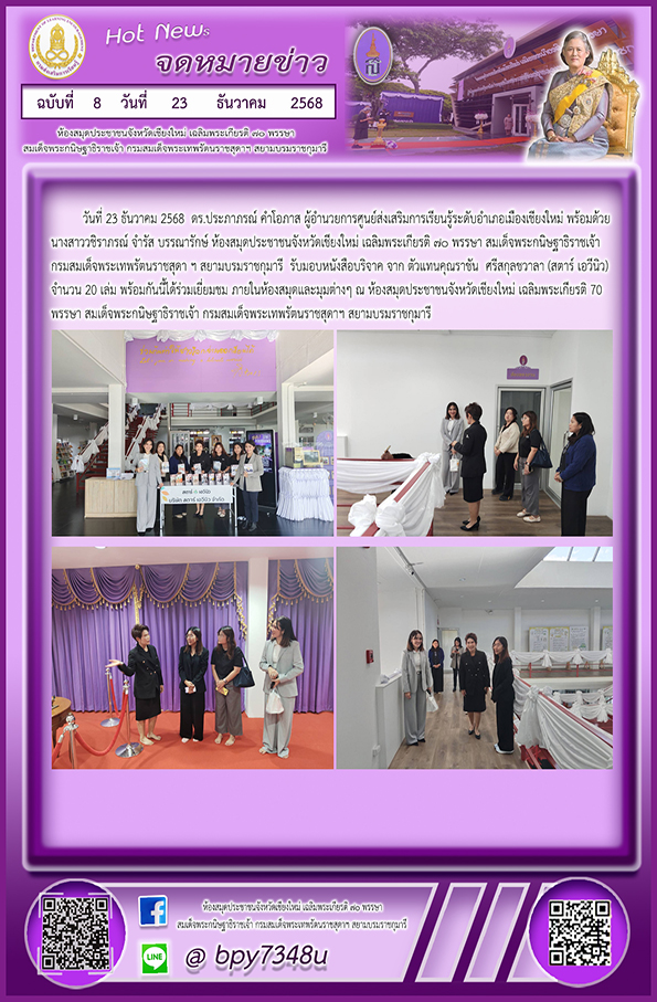 จำนวน 20 เล่ม พร้อมกันนี้ได้ร่วมเยี่ยมชม ภายในห้องสมุดและมุมต่างๆ ณ ห้องสมุดประชาชนจังหวัดเชียงใหม่ เฉลิมพระเกียรติ 70
