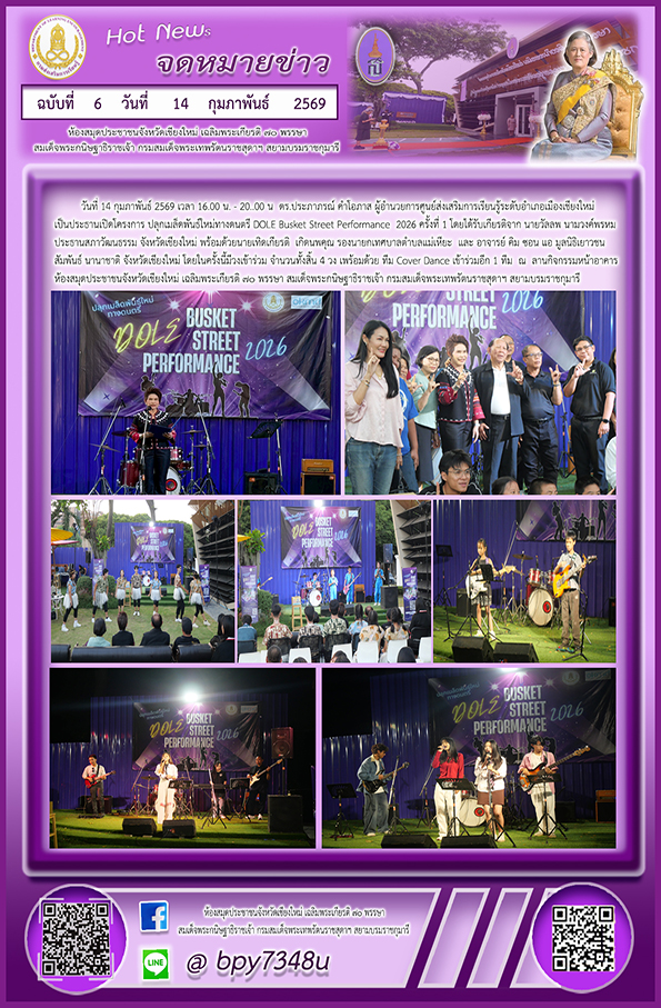 เป็นประธานเปิดโครงการ ปลุกเมล็ดพันธ์ใหม่ทางดนตรี DOLE Busket Street Performance 2026 ครั้งที่ 1 โดยได้รับเกียรติจาก นายวัลลพ นามวงค์พรหม