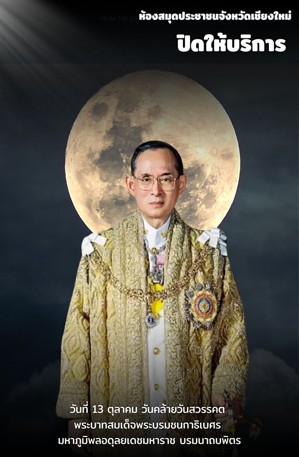 ห้องสมุดประชาชนจังหวัดเชียงใหม่ปิดให้บริการใน 13 ตุลาคม 2568 ซึ่งเป็นวันคล้ายวันสวรรคต พระบาทสมเด็จพระบรมชนกาธิเบศร มหาภูมิพลอดุลยเดชมหาราช บรมนาถบพิตร