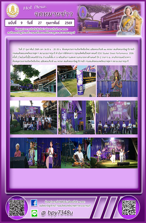 วันที่ 27 กุมภาพันธ์ 2569 เวลา 16.00 น. - 20..00 น ห้องสมุดประชาชนจังหวัดเชียงใหม่ เฉลิมพระเกียรติ ๗๐ พรรษา สมเด็จพระกนิษฐาธิราชเจ้า
