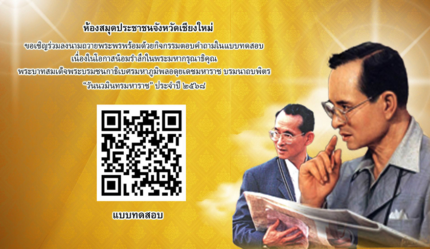 น้อมรำลึกในพระมหากรุณาธิคุณอันหาที่สุดมิได้ของพระมหากษัตริย์ผู้ทรงเป็นที่รักยิ่งของปวงชนชาวไทย ตราบนิรันดร์" ในการนี้ห้องสมุดประชาชนจังหวัดเชียงใหม่ ขอเชิญชวนทุกท่านร่วมกิจกรรมส่งเสริมการเรียนรู้ผ่านแบบทดสอบออนไลน์ กับห้องสมุดประชาชนจังหวัดเชียงใหม่