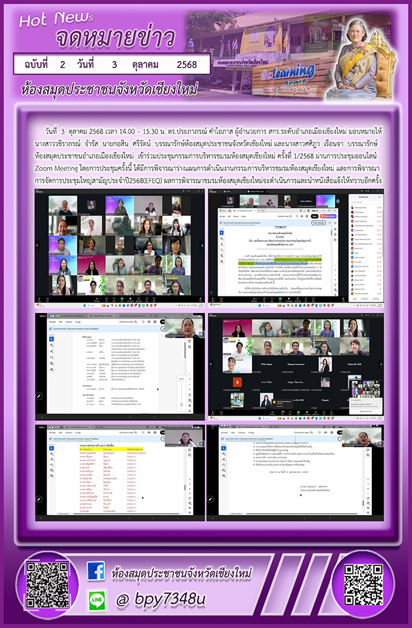ห้องสมุดประชาชนอำเภอเมืองเชียงใหม่ เข้าร่วมประชุมกรรมการบริหารชมรมห้องสมุดเชียงใหม่ ครั้งที่ 1/2568 ผ่านการประชุมออนไลน์