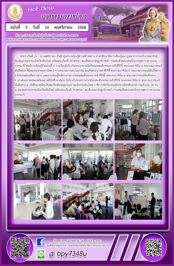 ณ ห้องสมุดประชาชนจังหวัดเชัยงใหม่ เฉลิมพระเกียรติ 70 พรรษา สมเด็จพระกนิษฐาธิราชเจ้า กรมสมเด็จพระเทพรัตนราชสุดาฯ สยามบรม