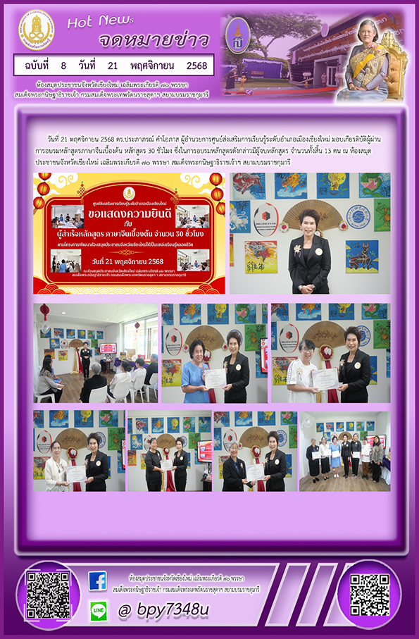 วันที่ 21 พฤศจิกายน 2568 ดร.ประภาภรณ์ คำโอภาส ผู้อำนวยการศูนย์ส่งเสริมการเรียนรู้ระดับอำเภอเมืองเชียงใหม่ มอบเกียรติบัติผู้ผ่าน