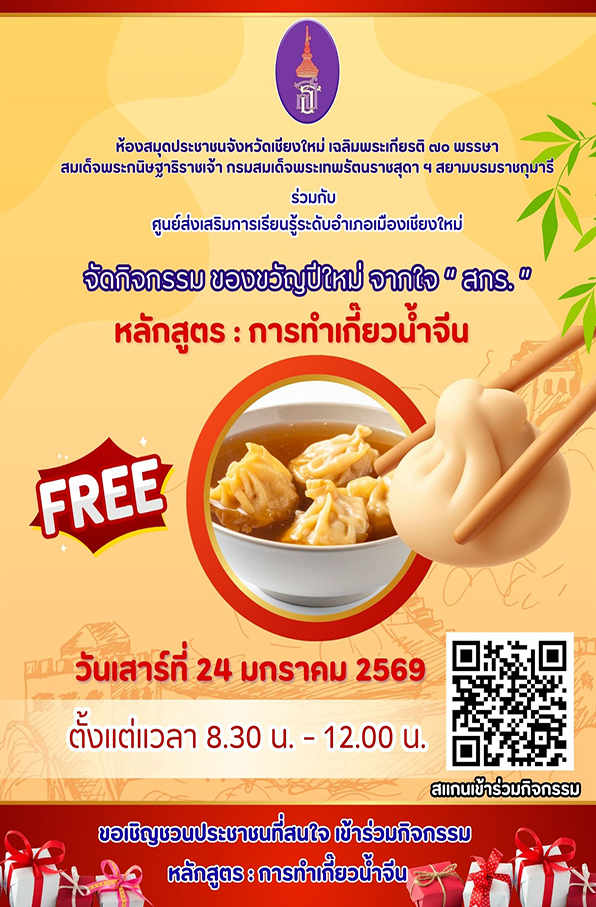 กรมส่งเสริมการเรียนรู้ จัดกิจกรรม ของขวัญปีใหม่ จากใจ สกร. โดย ศูนย์ส่งเสริมการเรียนรู้ระดับอำเภอเมืองเชียงใหม่ สอนการทำเกี๊ยวน้ำจีน โดยเปิดรับสมัครประชาชนผู้สนใจ