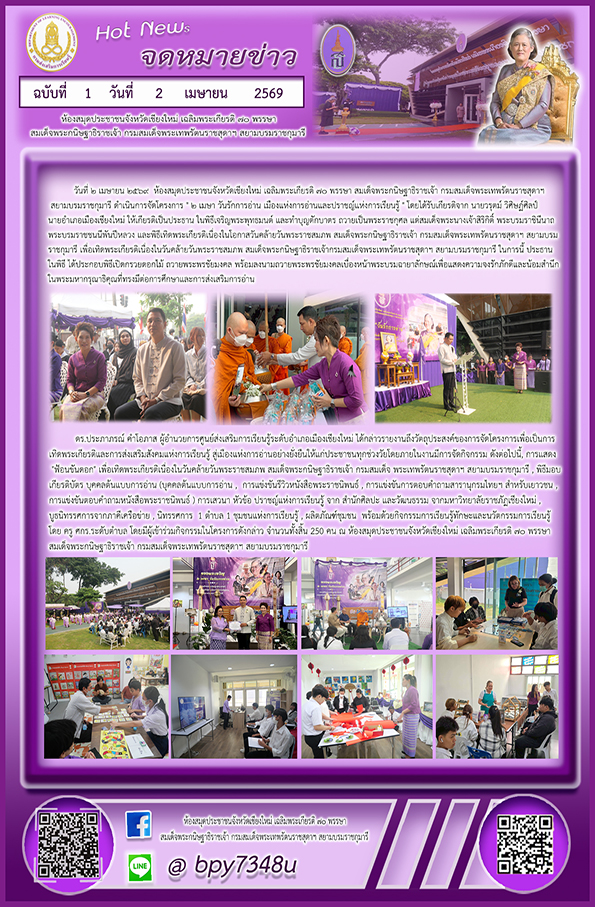 โดยภายในงานมีการจัดกิจกรรม ดังต่อไปนี้, การแสดง "ฟ้อนขันดอก" เพื่อเทิดพระเกียรติเนื่องในวันคล้ายวันพระราชสมภพ สมเด็จพระกนิษฐาธิราชเจ้า กรมสมเด็จ พระเทพรัตนราชสุดาฯ สยามบรมราชกุมารี , พิธีมอบเกียรติบัตร บุคคลต้นแบบการอ่าน (บุคคลต้นแบบการอ่าน , การแข่งขันรีวิวหนังสือพระราชนิพนธ์ , การแข่งขันการตอบคำถามสารานุกรมไทยฯ สำหรับเยาวชน ,การแข่งขันตอบคำถามหนังสือพระราชนิพนธ์ ) การเสวนา หัวข้อ ปราชญ์แห่งการเรียนรู้ จาก สำนักศิลปะ และวัฒนธรรม จากมหาวิทยาลัยราชภัฏเชียงใหม่ , บูธนิทรรศการจากภาคีเครือข่าย , นิทรรศการ 1 ตำบล 1 ชุมชนแห่งการเรียนรู้ , ผลิตภัณฑ์ชุมชน พร้อมด้วยกิจกรรมการเรียนรู้ทักษะและนวัตกรรมการเรียนรู้ โดย ครู ศกร.ระดับตำบล โดยมีผู้เข้าร่วมกิจกรรมในโครงการดังกล่าว จำนวนทั้งสิ้น 250 คน ณ ห้องสมุดประชาชนจังหวัดเชียงใหม่ เฉลิมพระเกียรติ ๗๐ พรรษา สมเด็จพระกนิษฐาธิราชเจ้า กรมสมเด็จพระเทพรัตนราชสุดาฯ สยามบรมราชกุมารี