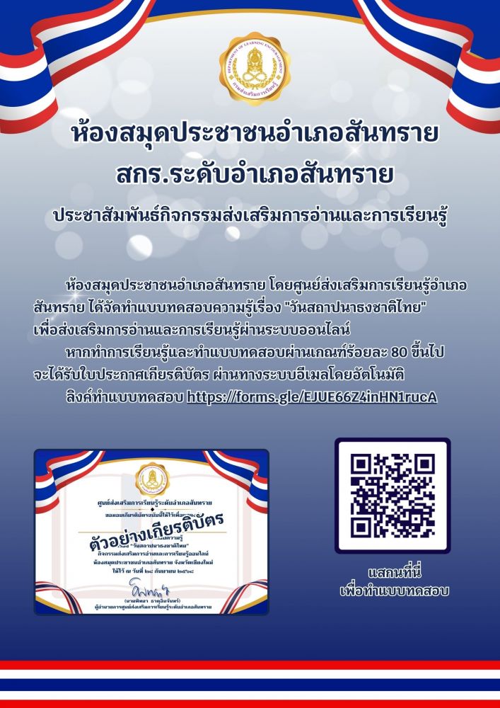 ห้องสมุดประชาชนอำเภอสันทราย โดยศูนย์ส่งเสริมการเรียนรู้อำเภอสันทราย ได้จัดทำแบบทดสอบความรู้ เรื่อง “วันสถาปนาธงชาติไทย” เพื่อส่งเสริมการอ่านและการเรียนรู้ผ่านระบบออนไลน์